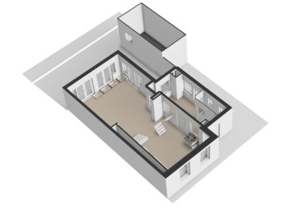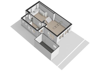 De woonkamer ligt op een lager niveau, wat zorgt voor een speelse en verrassende indeling. Strakke gestucte wanden en een moderne gevlinderde massieve betonvloer geven het geheel een eigentijdse uitstraling. Via de openslaande deuren wordt de verbinding met buiten optimaal benut.